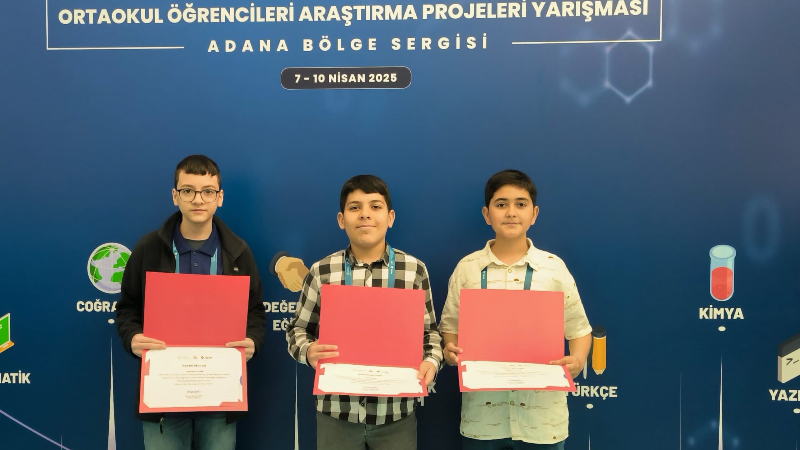 Türkiye Bilimsel ve Teknolojik Araştırma Kurumu (TÜBİTAK) tarafından düzenlenen 19. Ortaokul Öğrencileri Araştırma Projeleri Yarışması’nda, Erdem Koleji öğrencileri büyük bir zafer kazandı. Tam 1280 proje arasından sıyrılarak Türkiye ikinciliği elde eden öğrenciler, Adana Bölge Finali’nde sergiledikleri “Sıcaklık Değişiminin Ses Dalga Hızına Etkisinin STEAM Yöntemi ile Gösterilmesi” başlıklı projeleriyle bilim dünyasında adlarından söz ettirdiler.